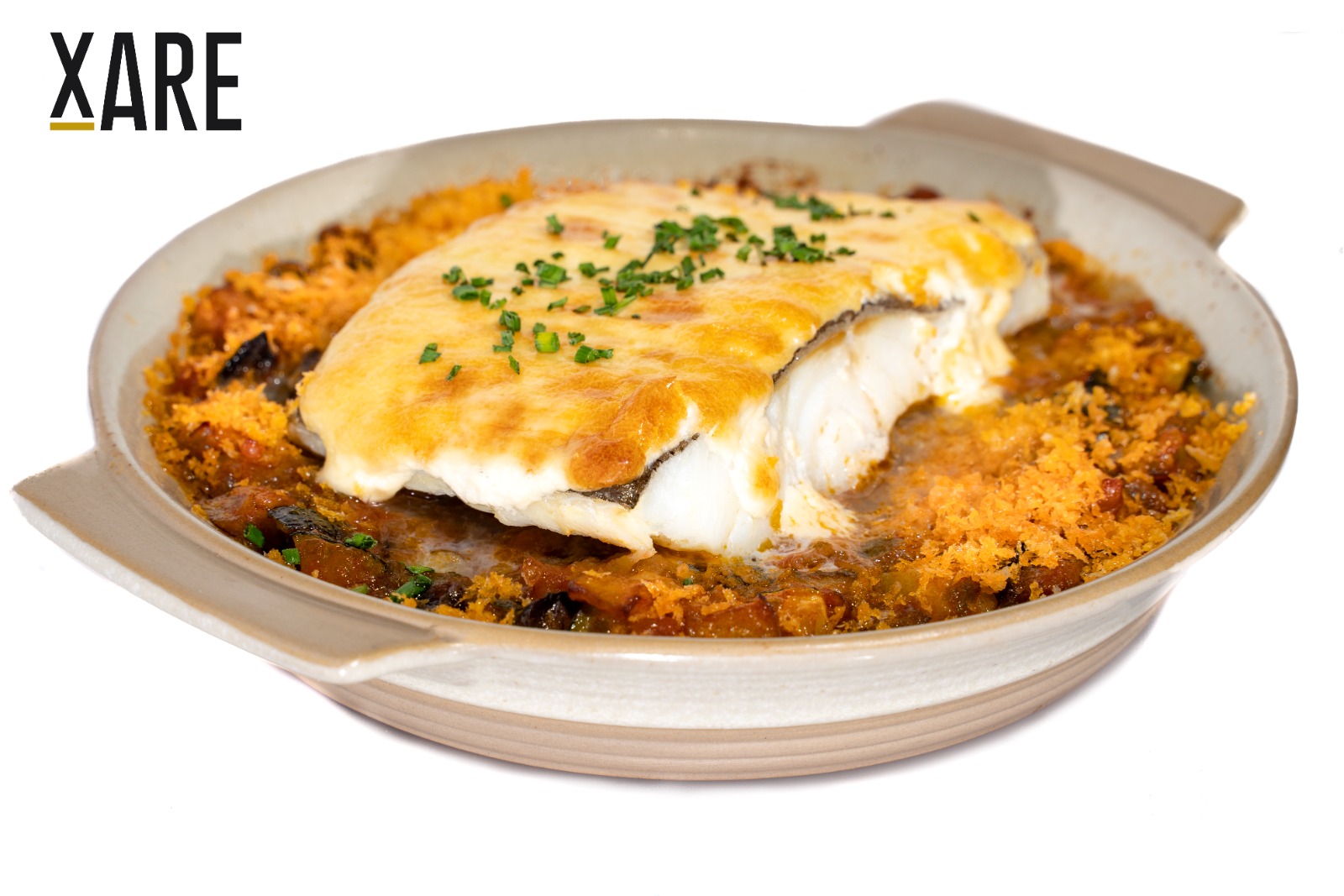 Bacalao con pisto manchego y emulsión de ajos asados